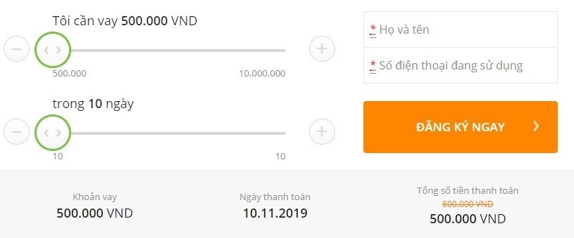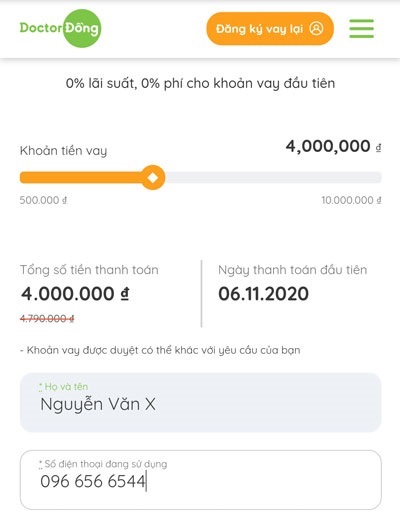 Truy cập trang chính thức của Doctor Đồng, kéo chọn số tiền muốn vay, nhập số điện thoại sau đó bấm “ĐĂNG KÝ NGAY“.
