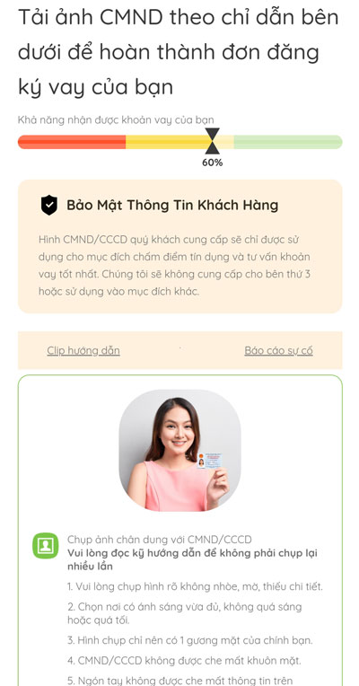 Lưu ý: Để tăng tỷ lệ duyệt, hãy chụp ảnh sao cho thông tin trên CMND rõ ràng và không bị che lấp.