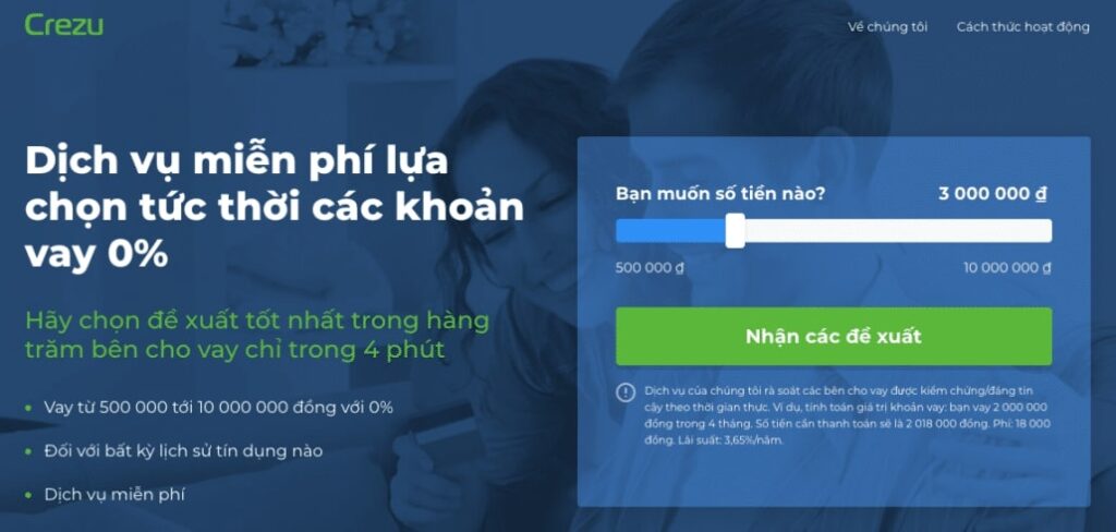 Số tiền và lãi suất do chính người vay quyết định cho mình. Dịch vụ của Crezu cho phép khách hàng lựa chọn các điều kiện vay tối ưu nhất từ hàng chục đề xuất khác nhau.
