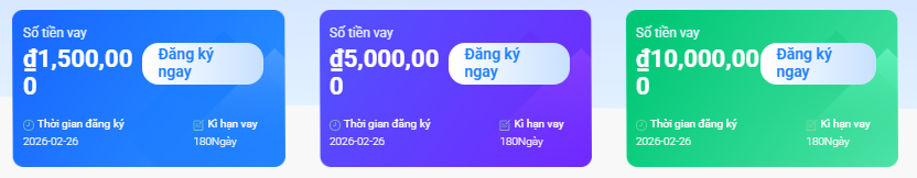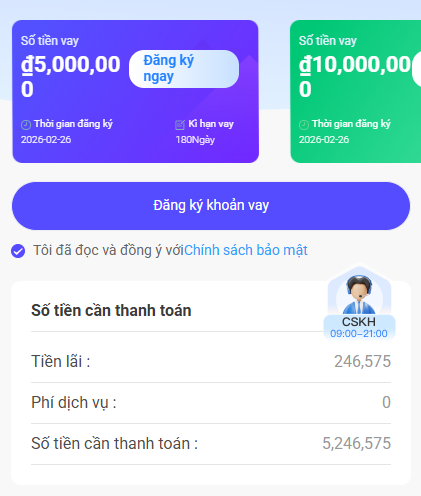 Khoản vay: Từ 1.000.000VNĐ đến 10.000.000VNĐ Kỳ hạn vay: 91-180 ngày Lãi suất vay: cao nhất 24%/năm + Phí kiểm soát rủi ro.