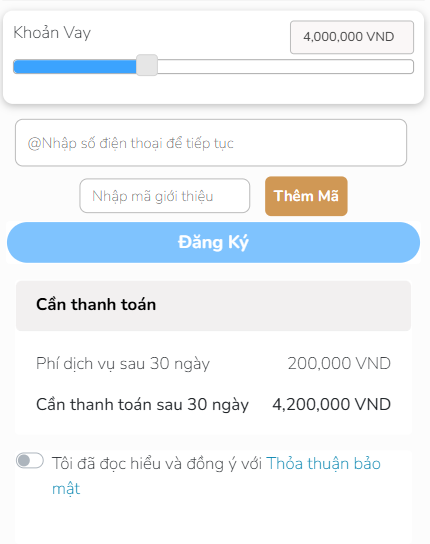 – Ví dụ khoản vay: 1.000.000 VNĐ và Khách hàng cần phải trả toàn bộ sau 120 ngày sử dụng Khoản vay. Tổng lãi và phí là 120.000 VNĐ, Tổng tiền thanh toán 1.120.000 VNĐ